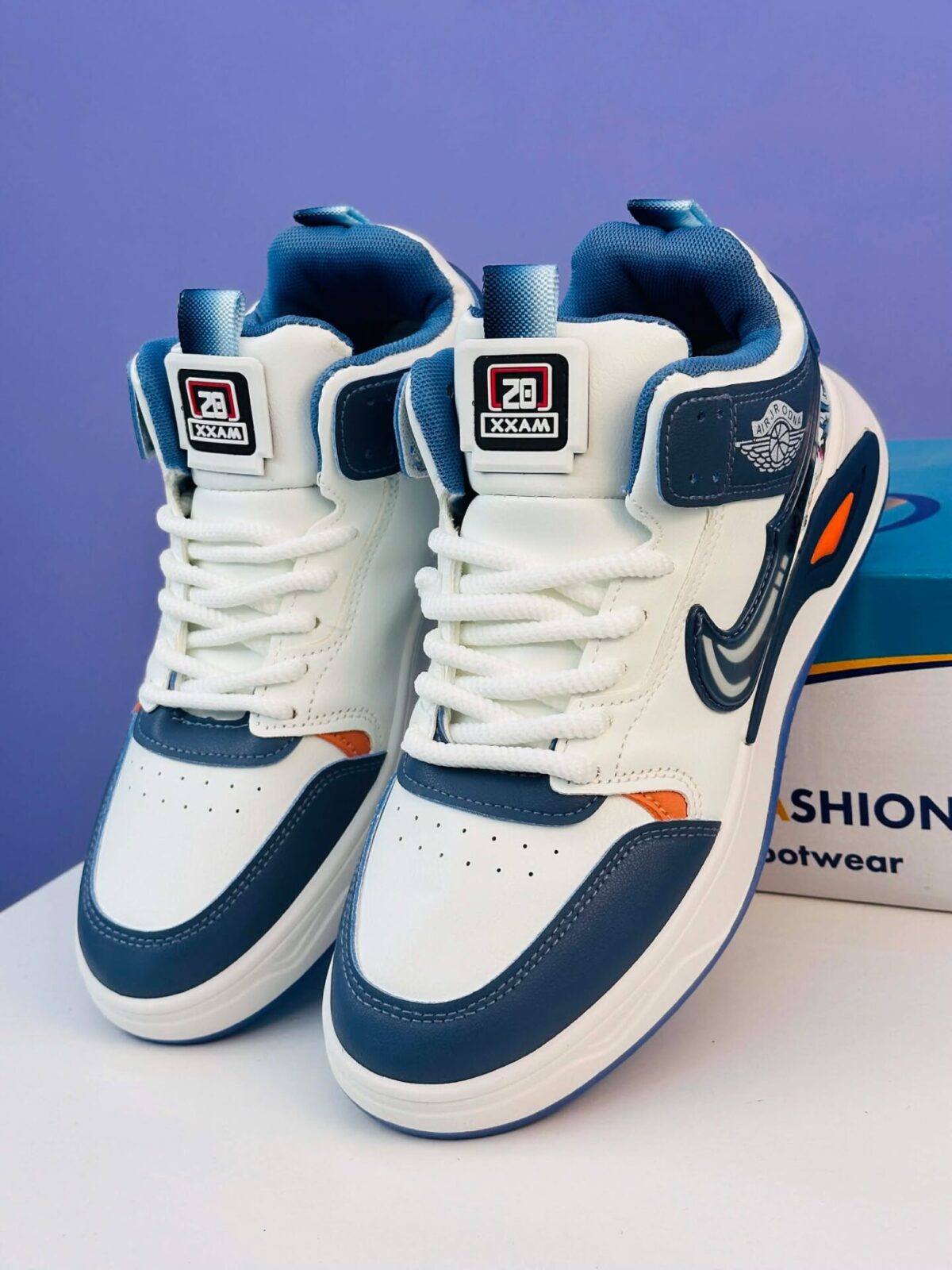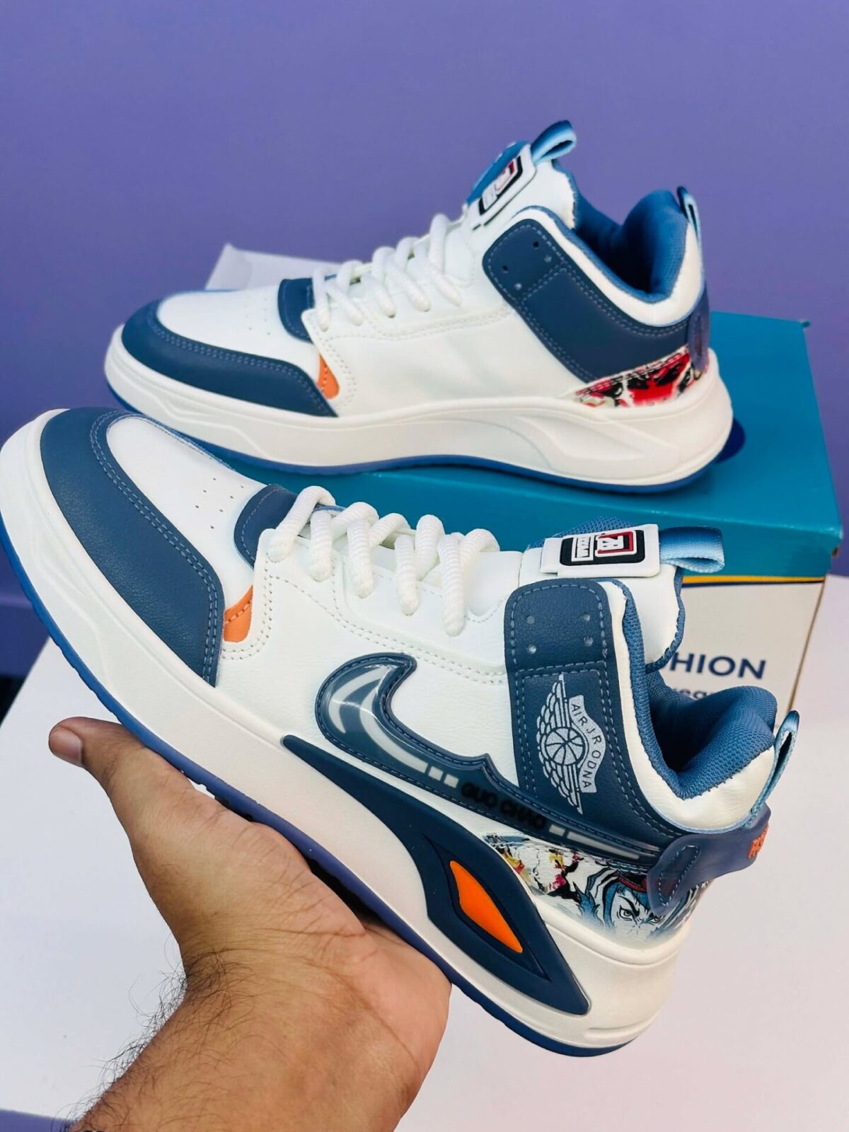 Design: Clean white upper paired with navy blue overlays and eye-catching orange detail. Transparent heel panel featuring a graphic print gives a bold modern look.